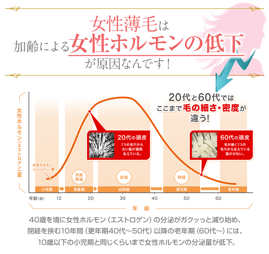 髪の育成や、女性の美しさ、活力には、女性ホルモンがとても重要です。しかし、このホルモンは、加齢と共にどんどん減少。