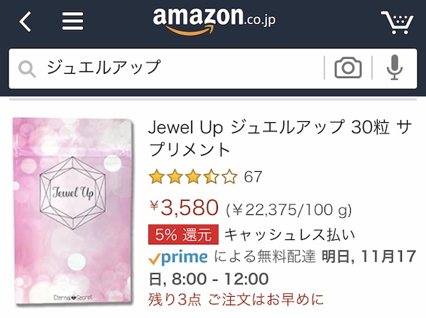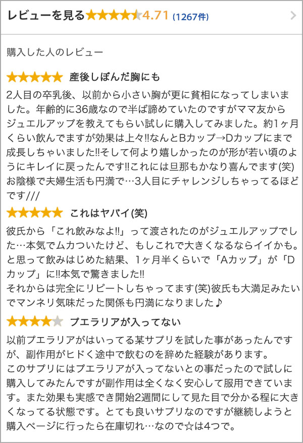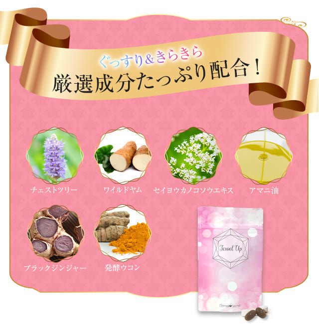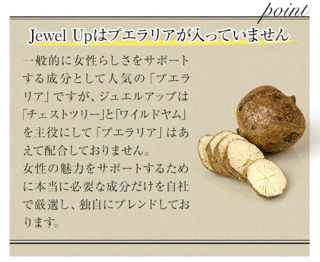 | 正しい努力が正義!必要な栄養は何か、を考えたときに日本のサプリ「ジュエルアップ」に出会ったわ。 ワイルドヤムが入っているし、安全だから絶対試した方がいいわね。 *個人の感想であり効果には個人差があります。 |